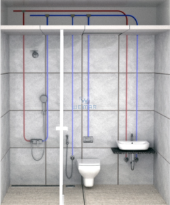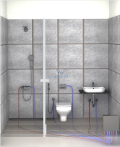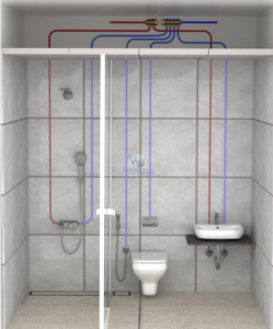 In this system, the manifolds are placed above the false ceiling of the bathroom. This is usually used in ceiling hung (suspended) pipe installations. In case of fixed ceilings like gypsum, or wood, a trap door is required to access manifolds for maintenance.